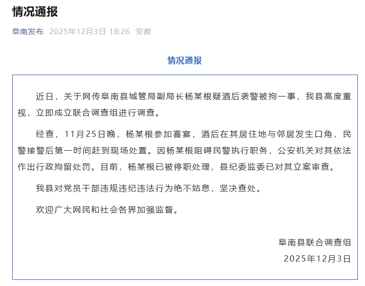 近日,关于网传阜南县城管局副局长杨某根疑酒后袭警被拘一事,我县高度重视现货配资平台多少钱,立即成立联合调查组进行调查。